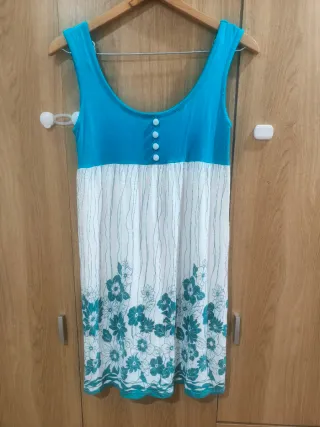 Vestido veraniego con un diseño de dos tonos y estampado floral. - Parte superior azul. - Falda blanca con estampado de flores en verde azulado. - Detalle de botones en la parte delantera superior. - Bajo con borde decorativo.