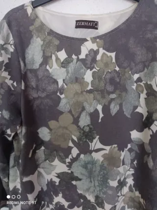 Vestido de Zermatt con estampado de flores y hojas en distintos verdes sobre fondo blanco roto. Cuello redondo. Manga francesa. Un poco elástico, se adapta muy bien. En perfecto estado.