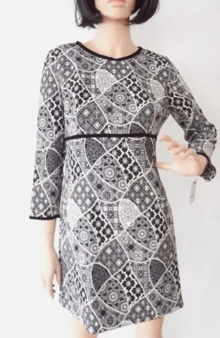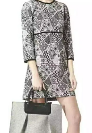 Vestido con un estampado geométrico en tonos grises y negros. Presenta un diseño original, moderno y versátil. Tipo patchwork, flores. - Manga larga. - Cuello redondo. - Detalle de ribete negro en cuello y cintura. Talla S. Zara Trafaluc. Pecho 45, largo 84 aprox