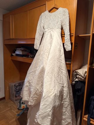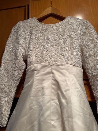 Vestido de comunión elegante y delicado. - Diseño con mangas cortas. - Detalle de con flores en la cintura y lazo en parte trasera. Una puesta y no todo el dia. Después tintorería. Esta perfecto - Tejido ligero y vaporoso.