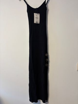 Vestido largo de tirantes en color negro. Presenta un diseño de canalé y detalles de flores plateadas en un lateral. - Diseño de canalé. - Detalle de flores plateadas.