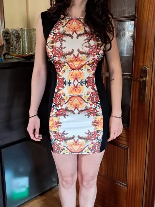 Vestido de Zara con un vibrante estampado floral sobre fondo negro. Ideal para añadir un toque de color a tu armario. - Diseño de manga corta. - Cuello redondo. - Largo hasta la rodilla.