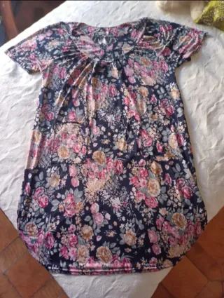 Vestido cómodo con estampado floral, ideal para estar en casa. Su diseño es ligero y agradable. Fondo azul marino y flores rosa y tostado, tela de punto flexible. Talla M/L. Azul claro con flores blancas, tela de punto flexible. Talla L. Azul claro y estampado flores amarillas. Tejido fresco. Talla 48 en etiqueta, pero da poca talla. 10€/ud.