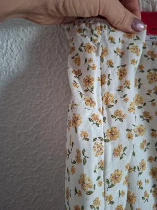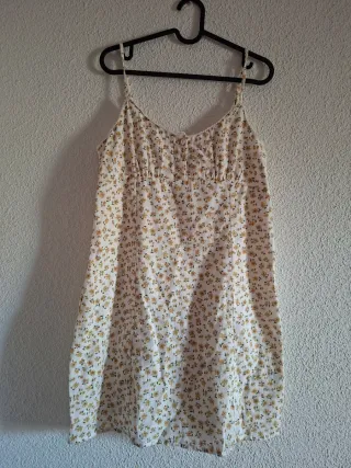 Vestido corto con estampado de flores amarillas, cremallera lateral, tirantes finos ajustables. Talla: L. Nuevo a estrenar, con etiqueta.