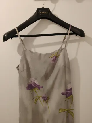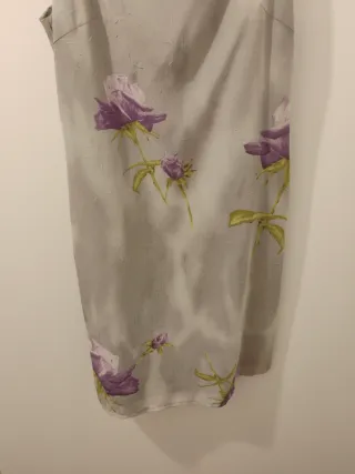 Vestido de tirantes con estampado floral. - Diseño con flores moradas sobre fondo gris claro. Este gris hace un efecto como difuminado en un gris algo más oscuro y blanco. - Tirantes finos ajustables. - Forro interior en tela gris. - Vestido corto. Usé una vez solamente. Costó 60 €. Perfecto estado.