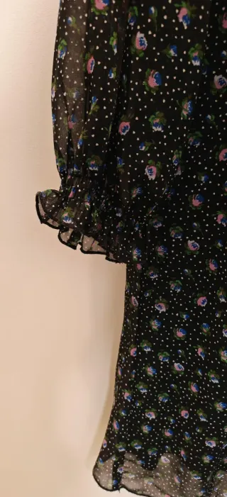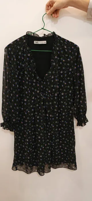 Vestido de Zara con estampado floral sobre fondo negro. Presenta un cuello con volantes y mangas largas con puños fruncidos. - Diseño con estampado de flores pequeñas. - Cuello con detalle de volantes. - Mangas largas con puños elásticos. - Tejido ligero y vaporoso.
