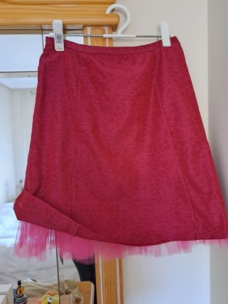 Conjunto de falda y blusa fucsia. Tejido bordado con flores en el mismo color. La falda lleva un volante de tul.Falda talla 40 y blusa talla42. Blusa cruzada con lavado de fajin.