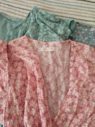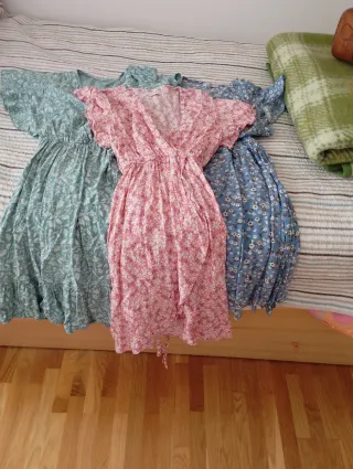 Conjunto de tres vestidos con estampados florales. - Vestido rosa con flores blancas y detalle de lazada. - Vestido verde con estampado floral blanco. - Vestido azul con estampado de pequeñas flores blancas.