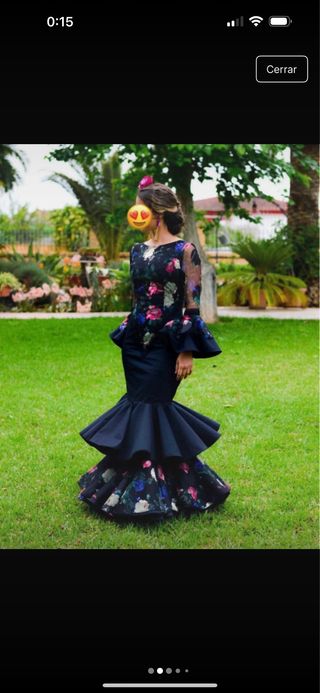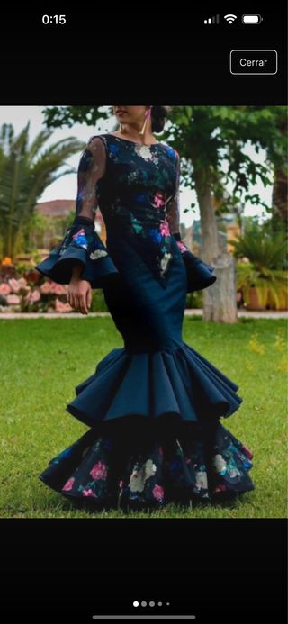 Traje de flamenca elegante y llamativo, con un diseño único. - Mangas largas con volantes. - Falda con múltiples volantes y estampado floral.0€ - Escote trasero pronunciado. 45