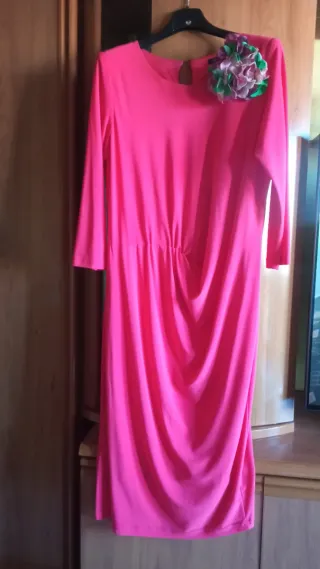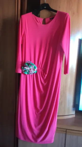 Vestido de la firma Dulcezza en talla 46. Color coral con un detalle floral que se puede poner en la cintura o en el hombro. Tejido en punto de seda, largo midi y mangas francesas, va forrado. El vestido es precioso y muy favorecedor. - Color coral. - Detalle de flor de quita y pon con broches. - Mangas francesas. - Corte drapeado en la falda. Perfecto estado, sólo tiene una puesta. Me costó 99€. Dulcezza Ceremonias, bodas...