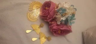 Vestido de flamenca con un vibrante estampado floral sobre fondo amarillo. Presenta volantes en las mangas y en la falda, aportando movimiento y estilo. - Diseño de manga larga. - Falda con múltiples volantes. - Se regala ramillete de flores a juego. Tengo otro vestido en el perfil! (Falda y blusa negra con adornos rosas)