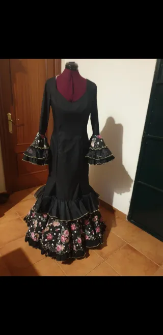 Vestido flamenca hecho a mano. Color negro con flores de varios colores. Ideal para combinar con muchos complementos. Bastante cómodo. Tiene bolsillo. -Medidas: Pecho: 89 Cintura: 69 Cadera: 100 Mido 1,69
