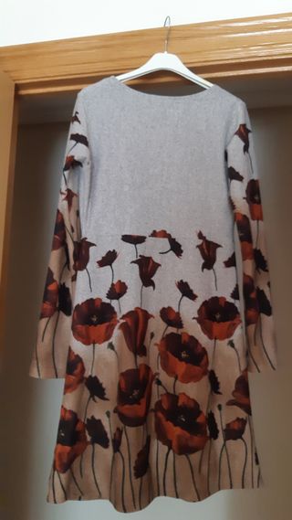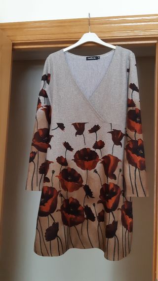 Vestido de manga corta con cuello vuelto de invierno. Estampado alegre. Marca Natura. Talla S