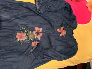 Talla 48...Color fucsia..Detalle de flores fijas en la cintura cor azul marino.Tirante en sisa y por encima manga grande abierta
