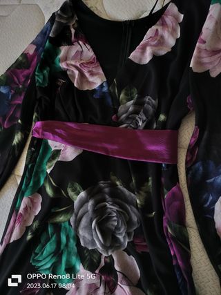 Vestido de manga corta con estampado de flores. Cierre cremallera en la espalda. Tiene abertura en la parte delantera y debajo lleva un pantalón corto en el mismo estampado del vestido. Tejido brillante, tipo raso. Se ha usado una vez.