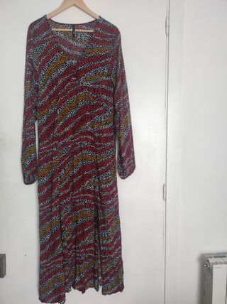 Vestido estilo boho chic con un vibrante estampado. - Diseño con escote en V y botones. - Mangas largas abullonadas. - Cintura fruncida con cordón. - Falda con volante muy ligera. Precioso y muy versátil. Impecable.
