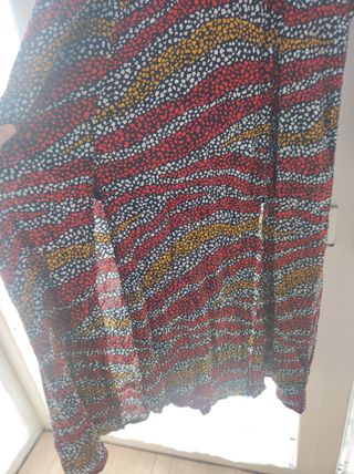 Usado una tarde. Talla 44 pero es bastante pequeña, sobre todo si tienes pecho. Tonos gris oscuro y negro (se aprecian bien en la última foto). Es bastante cortito. El tejido es gasa. Las mangas son transparentes y acaban en goma. Tiene forro. Medidas: Sisa - 55cm Largo - 86cm (un poco más por detrás)