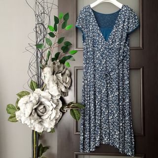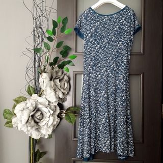 Vestido en tonos azul petróleo con flores blancas, talla 10 de Made in Italy. De sisa a sisa desde 48 cm. (cede), largo 95. 95% viscosa, 5 elastano.