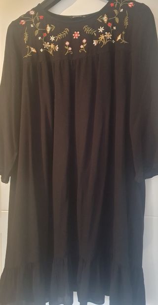 Vestido de Stradivarius en color negro con flores bordadas. Manga 3/4. Tiene forro. Talla L Mide 41cm de hombros y 92cm de largo.