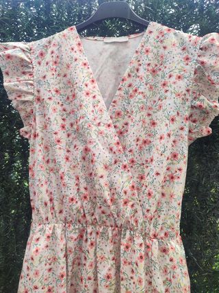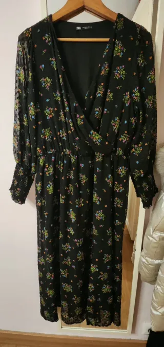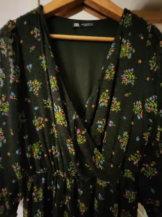 Vestido de flores muy favorecedor. Talla S de ZARA. Lleva cremallera invisible en un lateral. La manga tiene un botón por si se quiere llevar atado o más suelto. Abotonadura en el escote. Volante en la parte inferior. Solo 1 puesta, en perfecto estado.