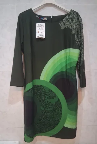 Vestido de la marca Desigual con un estampado vibrante. Diseño con escote redondo. Manga corta y largo hasta la rodilla. Aunque indica una XL la talla corresponde más a una L (referencia de la modelo: M)
