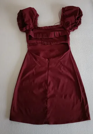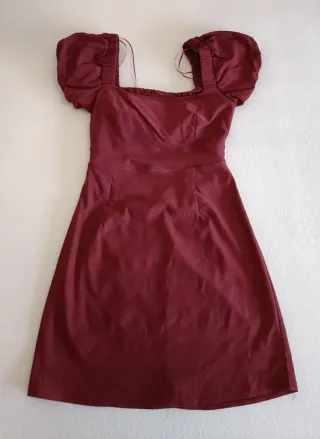 Vestido de color burdeos con un diseño elegante y moderno. - Escote cuadrado. - Mangas abullonadas cortas. - Cintura marcada. - Falda con corte A.