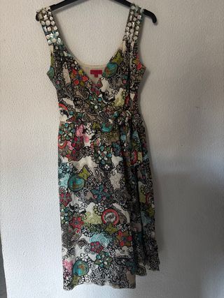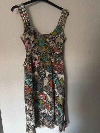 Vestido de la marca Desigual con un diseño vibrante y lleno de color. Talla M/L. - Estampado floral y abstracto. - Mangas cortas. - Escote en V. - Largo hasta la rodilla.