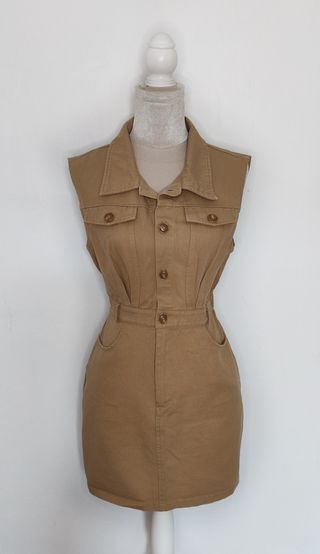Vestido de mujer sin mangas, diseño estilo safari con corte entallado que define la cintura y estiliza la silueta. Tejido estructurado tipo sarga, cómodo y con buena caída. Cuello camisero, botonadura frontal y bolsillos funcionales con solapa. Ideal para looks de diario, verano, entretiempo o estilo casual chic. Medidas: hombros 40 cm · sisa 46 cm · largo 75 cm Equivale aprox. a talla M (según medidas). #vestido #estilosafari #camel #vestidomujer #casualchic