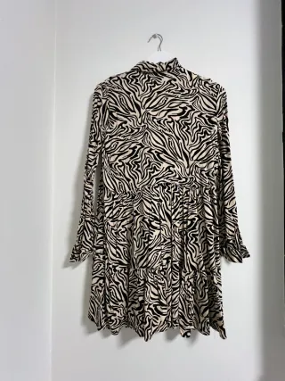 Vestido de manga larga con estampado de cebra. - Diseño camisero. - Cintura elástica. - Falda con volantes.