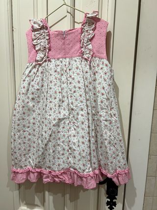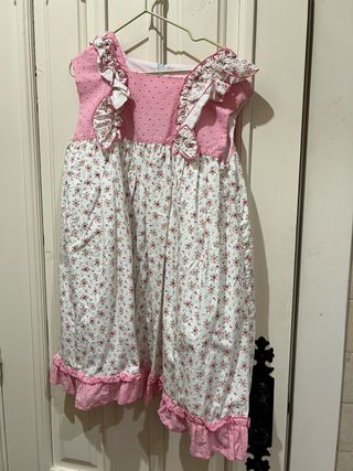 Vestido de corte ligero con un bonito estampado floral. - Escote en V con detalle de encaje. - Cintura elástica para un ajuste cómodo. - Mangas tres cuartos. - Bajo con vuelo. Marca de moda sostenible, Tiralahilacha tiene diseños cómodos y románticos hechos con materiales orgánicos. De muy buena calidad. Va forrado. Con goma en la cintura. En buen estado pero le faltan los botones de las mangas y tendrias que poner unos si lo quieres utilizar abrochado. Queda cortito.