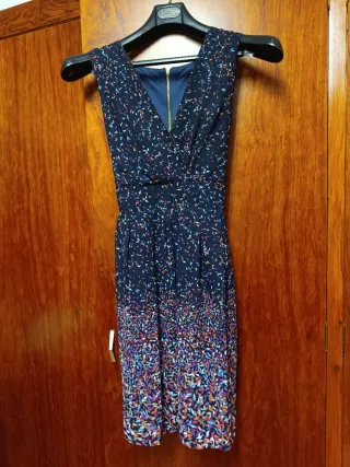 Vestido sin mangas de la marca Morgan. - Nuevo con etiquetas. - Diseño fruncido. - Se ata al cuello. - Tiene cremallera.