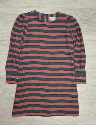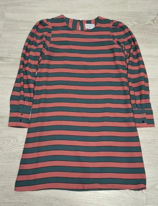 Vestido de corte evasé con estampado de rayas horizontales de color verde y rosa. Tejido fluido. Escote redondeado. Manga larga con volúmen en los hombros. Largo por encima de la rodilla. Cierre en espalda con abertura y botón. Forro interior.