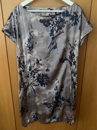 Vestido o camisola de Zara con un bonito estampado floral. - Diseño con mangas cortas. - Tejido satinado con caída. - Estampado en tonos grises y azules. Tiene bolsillos laterales y sienta al caer, apenas se arruga. Usado un par de veces pero como nuevo, en perfecto estado. Medidas: Ancho ( de axila a axila):52 cm Manga:18 cm Largo:90 cm