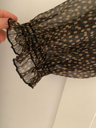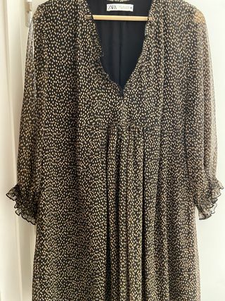 Vestido de Zara con estampado de topos en marrón sobre fondo negro. Diseño con escote en pico y mangas largas con volantes. - Estampado de topos. - Escote en pico. - Mangas largas con volantes.
