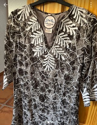 Vestido corto de cuello redondo con escote en pico, y manga 7/8 (detalle de cordón beige con abalorios). Tejido fino de viscosa en color azul marino con estampado floral en verde menta. Bordados beige en los laterales. Marca Unit, talla XL (hombros 46 cm, sisa 58 cm y largo 87 cm). Muy cómodo ya que queda suelto.