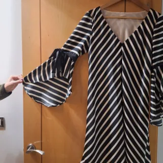 Vestido Liu Jo con un diseño original de rayas. - Manga acampanada con lazos. - Largo por debajo de la rodilla. - Escote en V pronunciado. - con forro -no ceñido en cadera - muy comodo