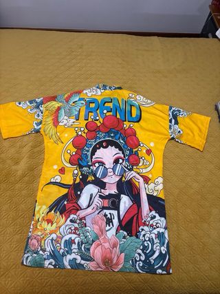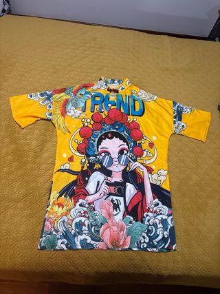 Vestido con estampado llamativo de estilo asiático. Diseño único con colores vibrantes. - Corte holgado. - Manga corta. - Cuello redondo.