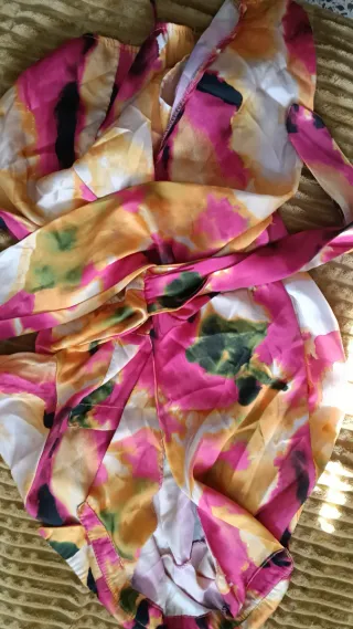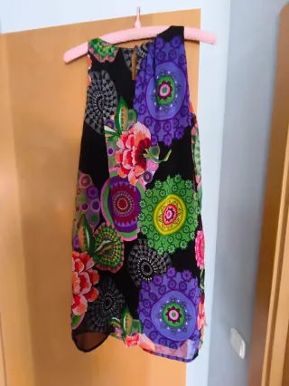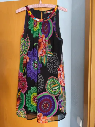 Vestido de tirantes con un vibrante estampado. Es un vestido para una ocasión especial para fiesta muy moderno y actual un estampado precioso una tela muy suave un cuello precioso que sienta muy bien se vende en 18 euros está nuevo flamante - Diseño con cuello adornado con cuentas. - Falda con vuelo y detalle de pliegues. - Tejido ligero y fluido.