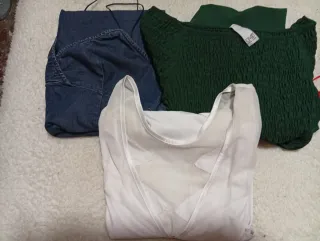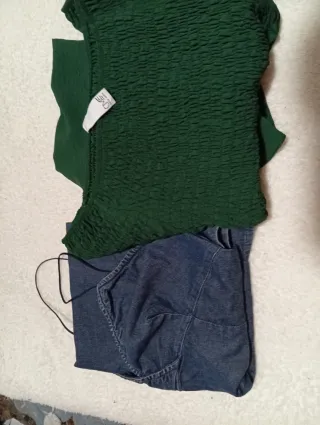Conjunto de dos vestidos. - Un vestido verde con textura y fruncido en el pecho - Un vestido vaquero azul. Escote pico. Unidad 2€ Todo 3'2€