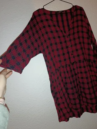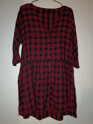 Vestido corto con estampado de cuadros escoceses en tonos rojos y negros. Presenta un diseño con botones en la parte frontal y una silueta fluida. Talla XS, pero es tallaje. Bershka. - Cuello en V. - Manga larga. - Cintura marcada con caída. - Largo hasta mitad muslo cuando se le añade al look un cinturón ancho. Queda muy bonito y rockero.