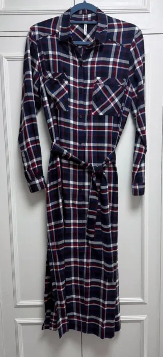 Vestido largo con estampado de cuadros en tonos marrones y rojos. Presenta un diseño camisero con cinturón. - Manga larga. - Cuello camisero. - Cinturón a juego. - Largo hasta los pies La tela no es tan gruesa , lo cual te permite usar abrigo sin problema