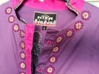 Vestido o camisola de la marca Niza con un diseño llamativo. - Color morado con detalles en rosa. - Talla S (36/8). - Adornos bordados en cuello y bajo. - Mangas 3/4 con estampado.