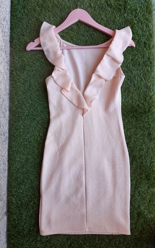 Precioso vestido de color rosa palo, ideal para ocasiones informales. Es un vestido entallado, de corte elegante y favorecedor. - Escote de pico con volantes. - Sin mangas. - Cierre de cremallera invisible en la espalda. - Tejido suave y agradable al tacto.