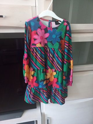 Vestido con un estampado vibrante y alegre. Se ha usado una sola vez. - Diseño desigual con flores y rayas. - Mangas largas. - Corte escalonado en la falda.