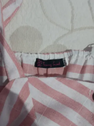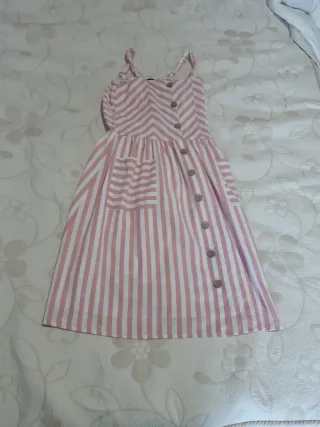 Vestido de tirantes con estampado de rayas verticales y detalles en zigzag en la parte superior. Presenta botones de madera en la parte delantera y un bolsillo. - Diseño de rayas rosas y blancas. - Detalle de zigzag en el corpiño. - Botones de madera. - Bolsillo lateral. Talla 14