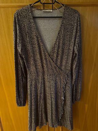 Vestido con estampado de manchas en tonos marrón y negro. Diseño cruzado con volantes. - Manga larga. - Cuello en V. - Estampado de manchas.