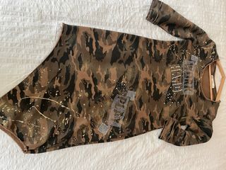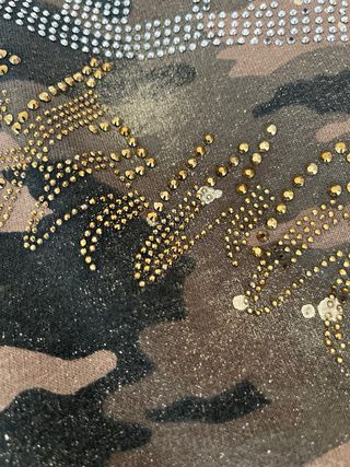 Vestido con estampado de camuflaje y detalles de pedrería. - Diseño de camuflaje en tonos marrones y negros. - Aplicaciones de pedrería brillante en la parte frontal. - Efecto salpicado en dorado y blanco.
