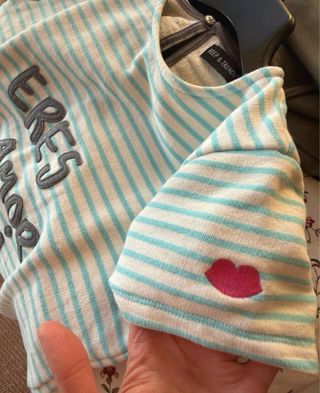 Vestido de rayas con un mensaje divertido. - 70 cm de largo y 40cm. de sisa. - Estampado frontal con texto Eres el amor de mi vida y un corazón. - Pequeño corazón rosa en la manga.