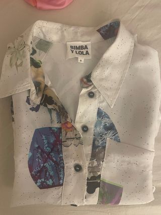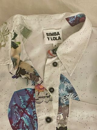 Vestido corto con estampado geométrico y flores. - Manga tres cuartos. - Cierre con cremallera en la espalda y dos pequeños botones. - Diseño estampado con detalles en azul, lila y blanco. - Muy cómodo y favorecedor - Desde el hombro hasta el bajo la altura es de 83 centímetros. - Está como nuevo porque solo me lo he puesto un par de veces. - No llevaba etiqueta porque me arañaba y la corté, pero está comprado en Stradivarius y es de la talla S.