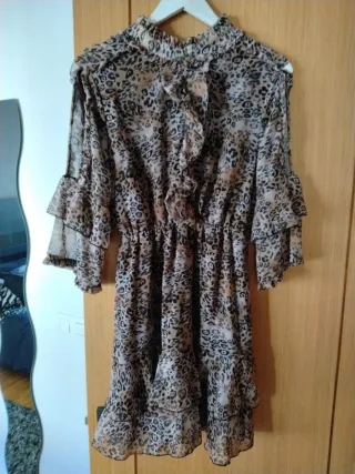 Vestido con estampado de leopardo y falda globo. Usado una sola vez - Mangas largas acampanadas. - Cuello alto. - Falda con volumen.